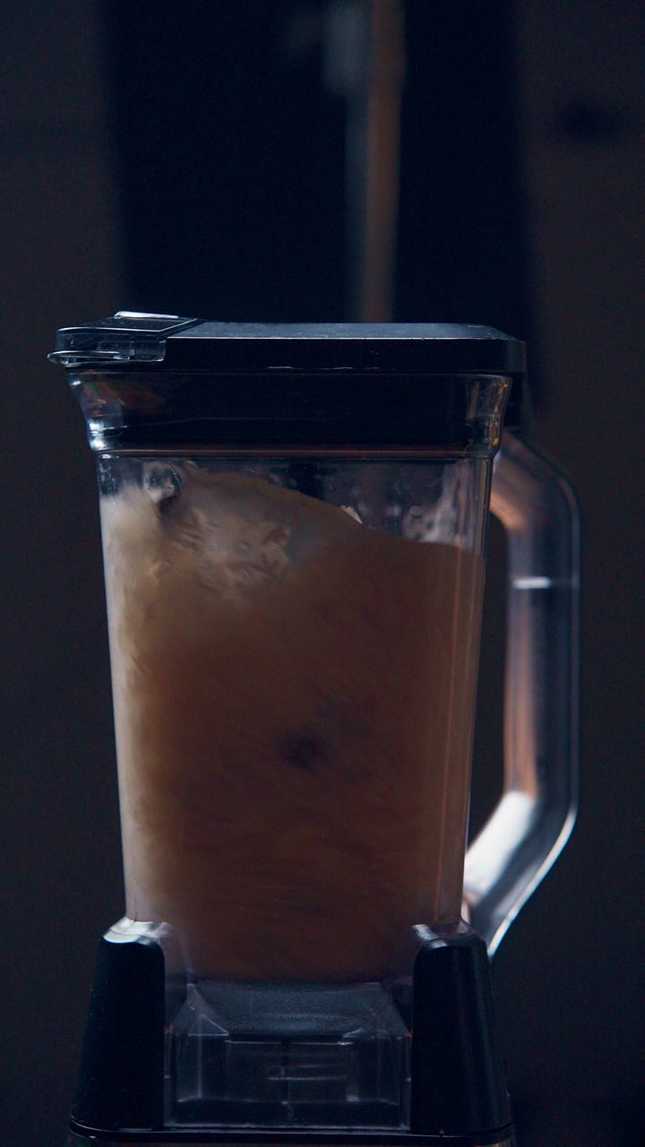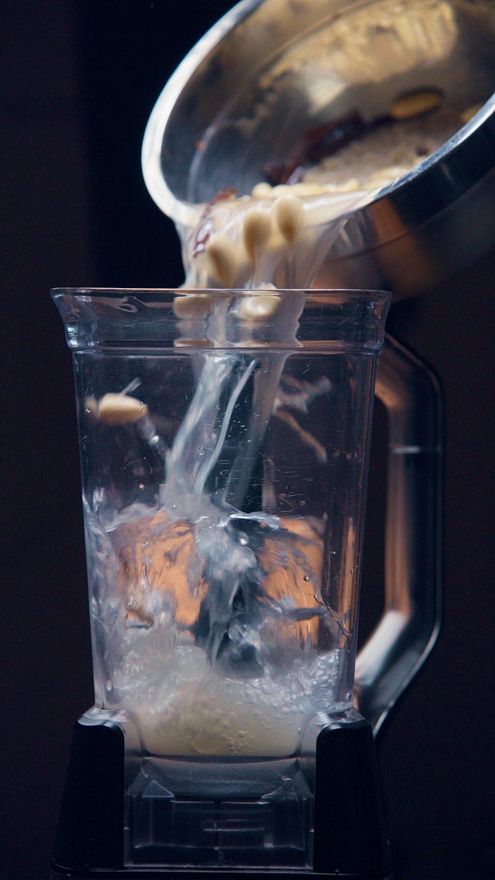 2. Blend. Remove the cinnamon stick and blend everything else — rice, almonds, soaking water on full power for 2 to 3 minutes. Longer than it seems like you need but the finer the blend, the silkier the drink.