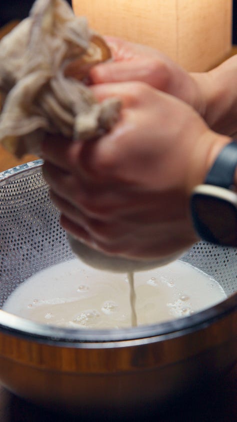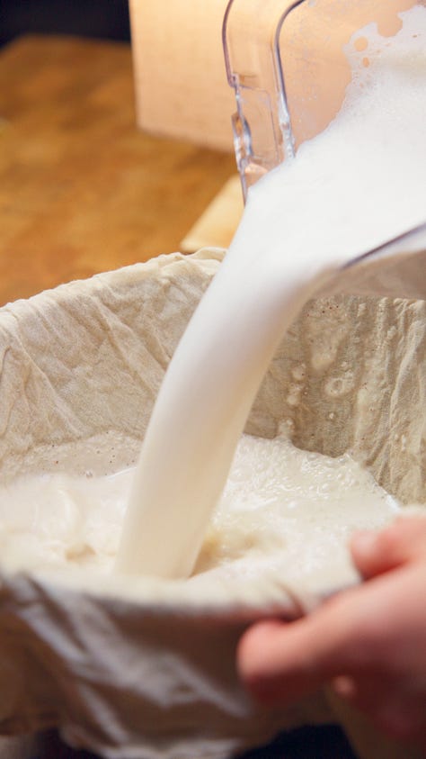 3. Strain twice. Pour through a cheese cloth over fine-mesh sieve or nut milk bag into a large pitcher. Let it drip through and squeeze out of the cheese cloth. it should be fine enough to not pass through