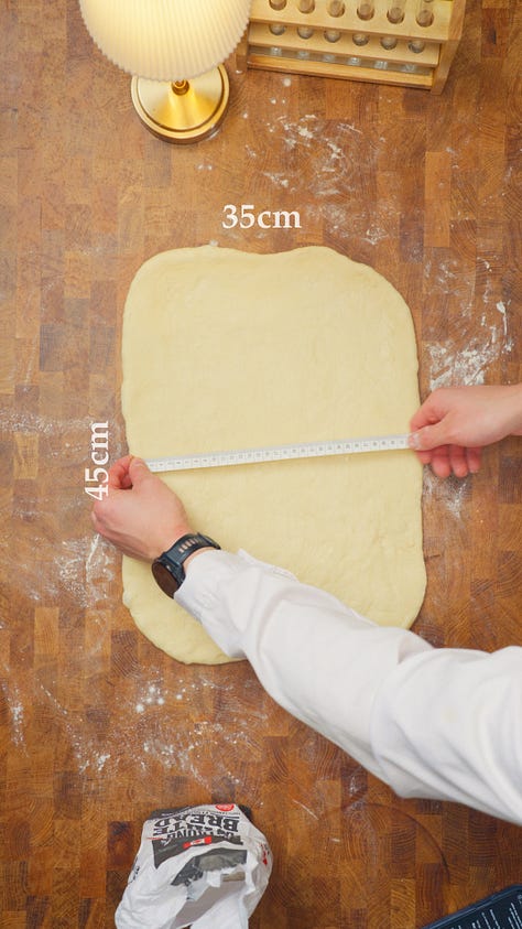 Then roll the dough into a rectangle measuring with measuring tape. The dough should be 35 x 45 cm and about 5-6mm thick.